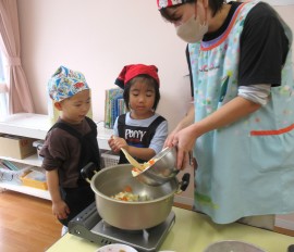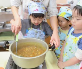 北星おおぞら認定こども園 ぶどう組クッキング 2025年11月7日(金) ぶどう組さんがカレー作りを行いました🍛じゃがいもは、めろん組さんが育てたものを使いましたよ☺じゃがいもを包丁で切る、具材を炒めるなどの工程をみんなで協力して、おいしいカレーができました✨ もどる