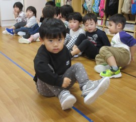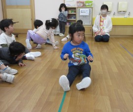 お尻歩きリレーとお絵描き「家族の絵」の活動をしています。
