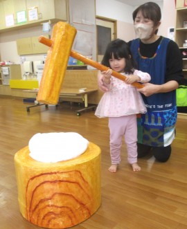 北星おおぞら認定こども園 おもちつき会 2025年12月11日(木) 今日は、おもちつき会がありました。3歳以上児さんは、お遊戯室でおもちつきについてのお話を聞き、出し物を見てから実際におもちをつきましたよ!みんなで頑張ってついたおもちは鏡餅になりました☺もも・みかん組さんは出し物を見て、おもちつきごっこをしています☺ もどる