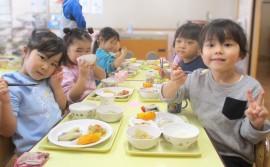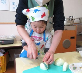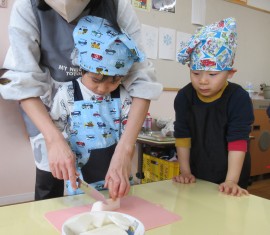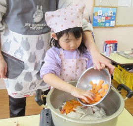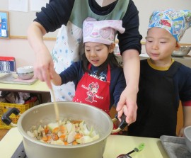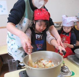 北星おおぞら認定こども園 ぶどう組クッキング 2026年2月4日(水) 今日は、ぶどう組さんが豚汁作りを行いました!じゃがいもやにんじんなどの具材を包丁で切る、炒めるなどの工程をみんなで協力して、おいしい豚汁ができました✨お家でもお手伝いしているよとお話していたぶどう組さん。楽しみながらクッキングしていましたよ☺️ もどる
