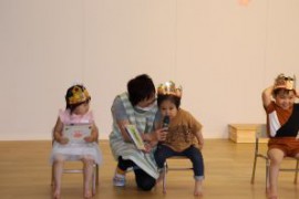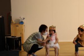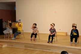 二部では、さくら・すみれ・ばら組のお友だち5名が前に出て、インタビューを受けています。好きな食べ物や動物など