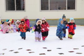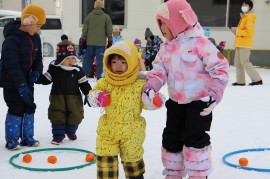 未満児クラスの子どもは、すみれ・ばら組のお友だちと手を繋ぎみかんを拾ってゴール🚩