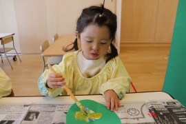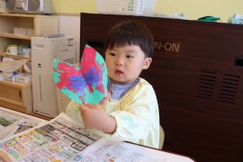 旭川おおぞら認定こども園 クラスの様子(たんぽぽ組) 2023年6月21日(水) 2歳児クラス 6月の制作様子です。葉っぱの上に絵の具でぬりぬり🖌した後は半分に折り、開いて完成✨デカルコマニーという技法を使って出来た作品は子ども達も達成感でいっぱいでした😊おたまじゃくしとカエルの顔も自分たちで描きましたよ!! もどる