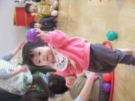 小さいクラスはボールを持って箱に入れるゲーム、