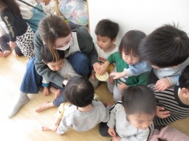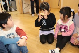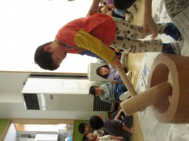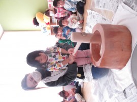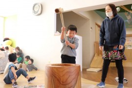 旭川おおぞら認定こども園 おもちつき会 2024年12月10日(火) 今日は、おもちつき会がありました!保育者から、もち米のお話を聞いた後は、もち米を見たりおもちつきの歌を歌いました!ちゅうりっぷ・もも組は、小さな臼と杵でおもちつきごっこたんぽぽ・さくら・すみれ・ばら組、大きな臼と杵でおもちつきをしました!みんな、力いっぱいお餅をついていましたよ✨お餅がビヨーンと伸びる所を見て、大喜びでした! もどる