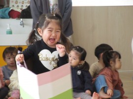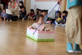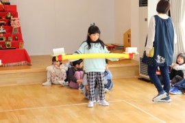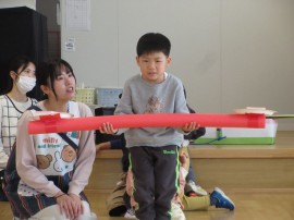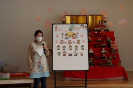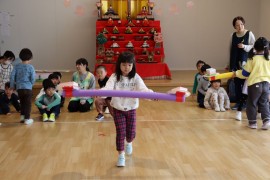 旭川おおぞら認定こども園 おひなまつり会 2025年3月3日(月) 今日は、おひなまつり会がありました。初めに、保育者のパネルシアターでひなまつりの由来を聞いたり、ひなまつりの歌を歌ったりして楽しみました!制作発表では、代表のお友だちが発表してくれました。頑張った所や作り方を上手に発表してくれましたよ!その後は、ひしもちを使ったゲームを楽しんでいます。急いで、慎重にゲームを楽しんでいました。昼食では、ひなまつりのご飯が出てきて、美味しそうに食べていました! もどる