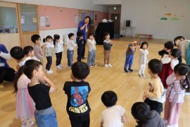 旭川おおぞら認定こども園 すみれ組 初めての英語教室 2025年4月15日(火) すみれ組さん初めての英語教室でした。英語教室のランス先生とナミエ先生が来てくれて、「happy,sad,sleepy,angry,hangry」などのジェスチャーを教えてくれました。音楽に合わせて身体を動かしたり、名前を呼ばれて元気よく手を挙げるなどすごく楽しんでいました。 もどる