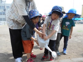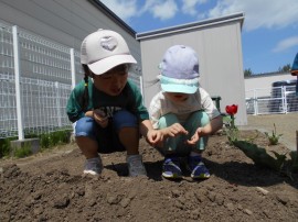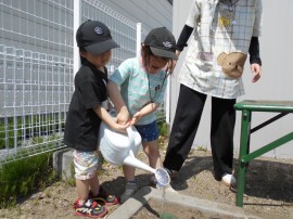 旭川おおぞら認定こども園 今日のばら組・すみれ組の様子 2025年5月16日(金) 今日は畑に苗や種まきをしました。ばら組は、じゃがいも、ミニトマト、人参を植え、すみれ組は、枝豆となすびを植えました!スコップで穴を掘ったり、土をかけたり、水をあげて「大きくなれ~」と願いを込めていましたよ! もどる