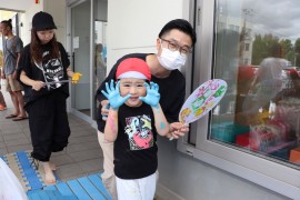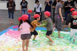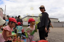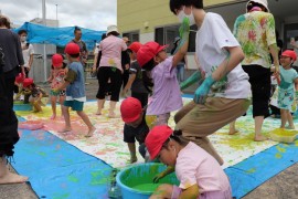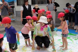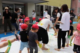 旭川おおぞら認定こども園 すみれ組参観日 2025年7月11日(金) 今日は、すみれ組の参観日があり、ボディペインティングをしました。絵の具で手形を取ってうちわの制作をしたり、絵の具を使ったシャボン玉遊びをしたり、親子で給食を食べました!普段体験できない遊びを存分に楽しみました! もどる
