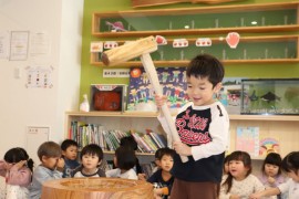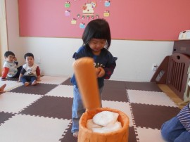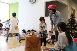 旭川おおぞら認定こども園 おもちつき会 2025年12月9日(火) 今日はおもちつき会がありました!保育者から、もち米のお話を聞いた後はおもちつきの歌を歌って、餅つきを楽しみました!みんな力いっぱいお餅をついていました! もどる