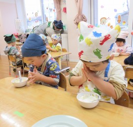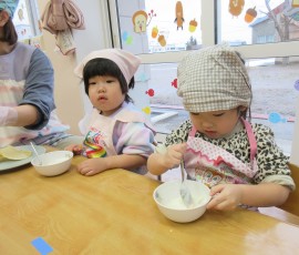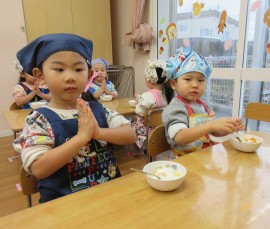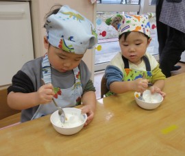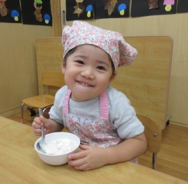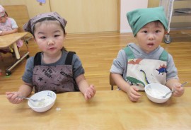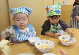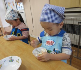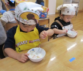 北星おおぞら認定こども園 みかん組クッキング 2024年11月25日(月) 今日は、みかん組さんがフルーツヨーグルト作りをしました!カットされた果物をすくってお皿に入れる、ヨーグルトを入れてもらい混ぜる工程を行っています☆「おいしい!」とニコニコ笑顔で食べていましたよ☺ もどる