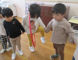 フープ送りリレーでは、頭と足どちらから入れようかを考えながら行っていました。