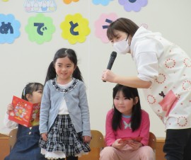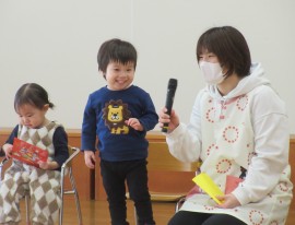 北星おおぞら認定こども園 3月お誕生会 2025年3月19日(水) 3月生まれさんのお誕生会がありました🎂先々月のお誕生会に参加できなかった子も合わせて、3歳未満児の会で2人・3歳以上児の会で7人がみんなにお祝いをしてもらいました✨職員から出し物は、ぬいぐるみの人形劇でしたよ!会食は、ジャムサンド、中華風ローストチキン、バンサンスー、スーミータン、デコポンでした。 もどる