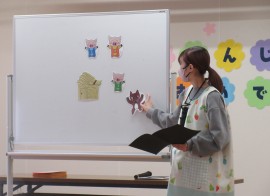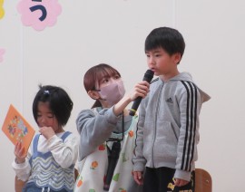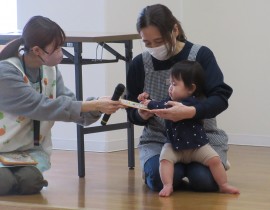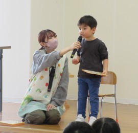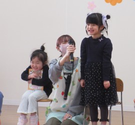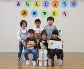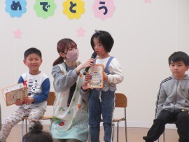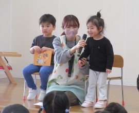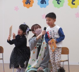 北星おおぞら認定こども園 4月お誕生会 2025年4月25日(金) 4月生まれさんのお誕生会がありました🎂3歳未満児の会で3人・3歳以上児の会で6人がみんなにお祝いをしてもらいました✨職員からの出し物は、3匹のこぶたのマグネットシアターでしたよ!会食は、じゃこわかめごはん、エビフライ、マカロニサラダ、豆腐と長ネギの味噌汁、バナナでした。 もどる