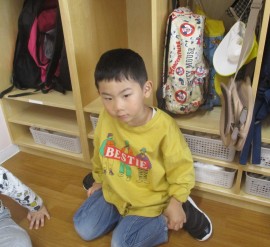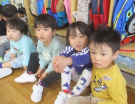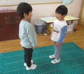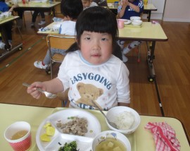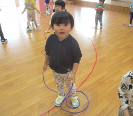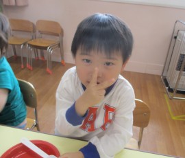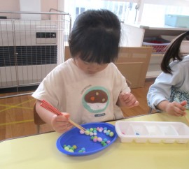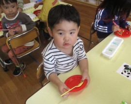 なわとびや手押し相撲をして体を動かしたあとは、スプーンや箸を使って食具の練習をしました。