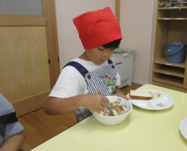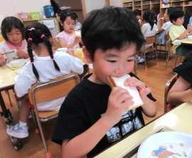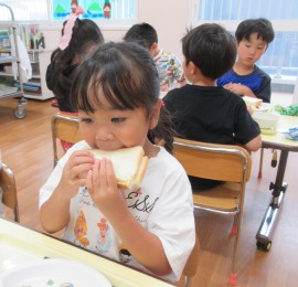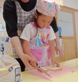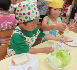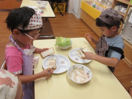 北星おおぞら認定こども園 めろん組クッキング 2025年6月30日(月) めろん組さんがツナサンド作りを行いました!食パンを包丁で切り、レタスとツナマヨをのせましたよ!手際よく作っていためろん組さんです👏 もどる