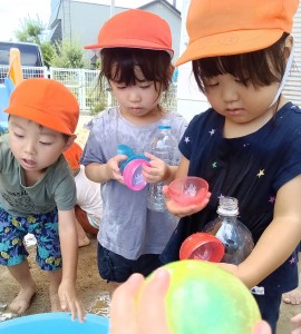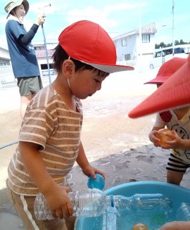 ペットボトルに水を入れて楽しみました。