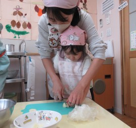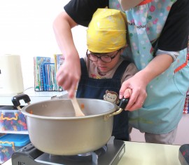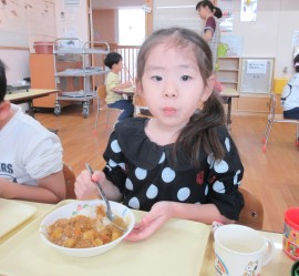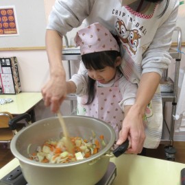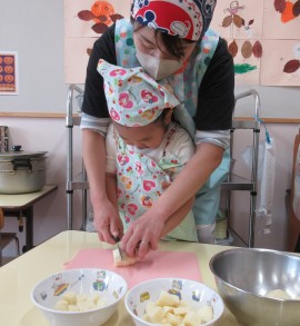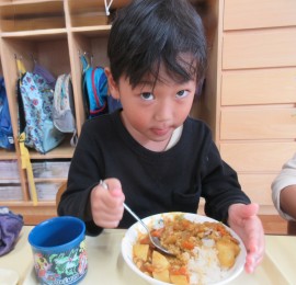 北星おおぞら認定こども園 ぶどう組クッキング 2025年11月7日(金) ぶどう組さんがカレー作りを行いました🍛じゃがいもは、めろん組さんが育てたものを使いましたよ☺じゃがいもを包丁で切る、具材を炒めるなどの工程をみんなで協力して、おいしいカレーができました✨ もどる