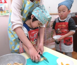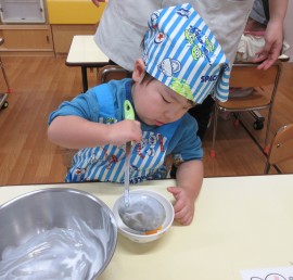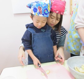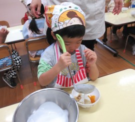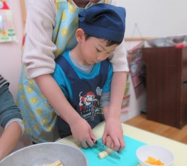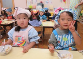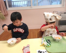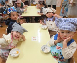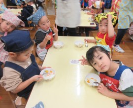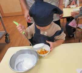 北星おおぞら認定こども園 ばなな組クッキング 2025年11月11日(火) 今日は、ばなな組さんがフルーツヨーグルト作りをしました!包丁でバナナを切る、ヨーグルトをおたまで入れる工程を先生と一緒に行いましたよ☆上手にできたね🤗 もどる