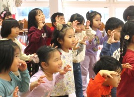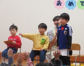 北星おおぞら認定こども園 11月お誕生会 2025年11月14日(金) 今日は11月生まれさんのお誕生会がありました🎂3歳未満児の会で2人・3歳以上児の会で6人がみんなにお祝いをしてもらいましたよ✨出し物は、もも組さんが『きのこ』の曲に合わせてダンスを披露してくれました☺職員からは『やんちゃ怪獣どっかーん』のダンスでしたよ!会食は、チキンライス、鶏肉のマーマレード焼き、野菜添え、コンソメスープ、オレンジでした。 もどる