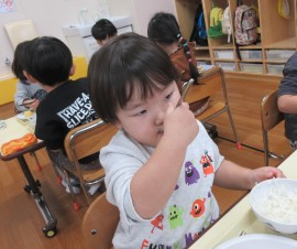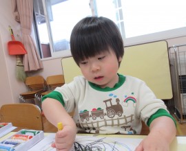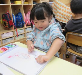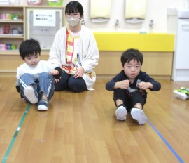 お尻歩きリレーとお絵描き「家族の絵」の活動をしています。