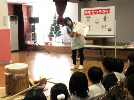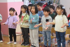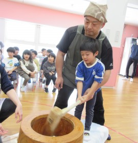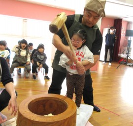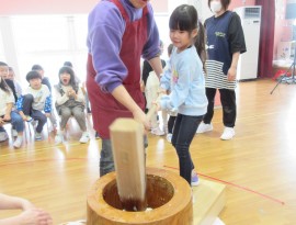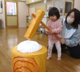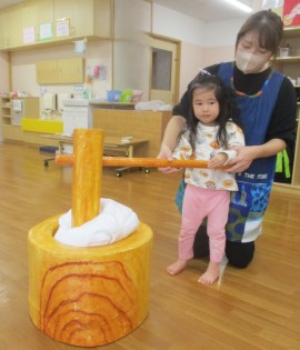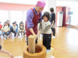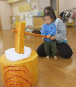 北星おおぞら認定こども園 おもちつき会 2025年12月11日(木) 今日は、おもちつき会がありました。3歳以上児さんは、お遊戯室でおもちつきについてのお話を聞き、出し物を見てから実際におもちをつきましたよ!みんなで頑張ってついたおもちは鏡餅になりました☺もも・みかん組さんは出し物を見て、おもちつきごっこをしています☺ もどる
