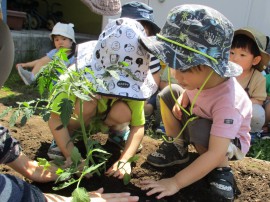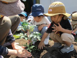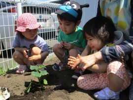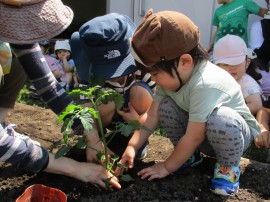 永山おおぞら認定こども園 ちゅうりっぷ組(苗植え) 2022年5月26日(木) 今日は、ちゅうりっぷ組のみんなで園庭の裏の畑にトマト🍅やきゅうり🥒を植えました❗二人ペアになって、土の中に苗を入れ『大きくな~れ✨』と土をかけました。みんな土にあまり触れたことがなかったので、『そ~っと』触り💦ちょっと嫌そうにしている子もいましたよ😁園庭の畑のトマト🍅やきゅうり🥒も美味しく育ちますように🙏 もどる