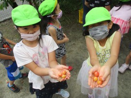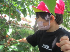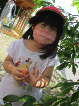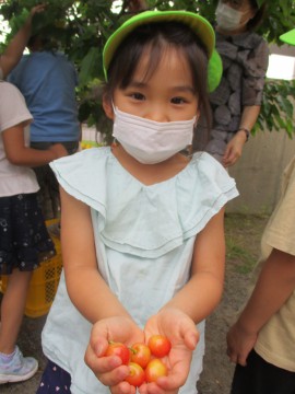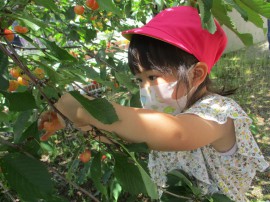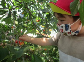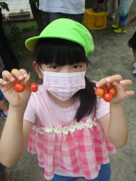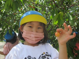 永山おおぞら認定こども園 🍒 さくらんぼ狩り 🍒 2022年6月22日(水) 今日は、たんぽぽ・ゆり・ひまわり組のみんなで園庭にある、さくらんぼ🍒を収穫しました❗思った以上に強く引っ張らないと採れず、『か、かたい💦』『とれない💧』と言う子もいましたが、とれた時には『とれた~❗』『おいしそう😋』と嬉しそうなこども達でした❗採れたさくらんぼ🍒は、ジャム🥄にしておやつ🍪にスコーンの上にのせて食べました。みんな喜んで食べていましたよ😊 もどる