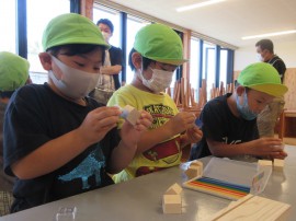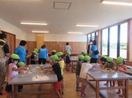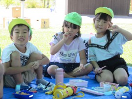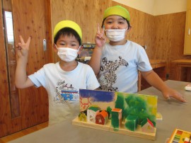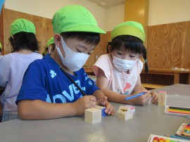 永山おおぞら認定こども園 🌻 園外保育 🌻 2022年7月21日(木) 今日はひまわり組の園外保育がありました❗バス🚌に乗って当麻の「くるみなの木遊館」に行きました😊木遊館では、自分で選んだ好きな形の木の建物🏠にクレヨンやスタンプ台を使って色を塗り、色鉛筆で窓や背景⛺を描いて『まちなみ』を作りました。その後、施設内の遊具🧸で遊んで、『くるみなの庭』でお弁当🍙を食べた後も『くるみなの庭』でいっぱい遊んで🏃♂️きました😄 もどる