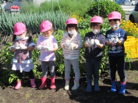 菜園まで歩いて行く途中、『いっぱいあるかな❓・大きいかな❓』と、おともだちとお話しながら、みんな期待を膨らませて向かっていました😄