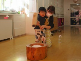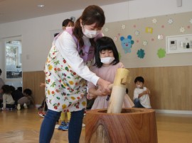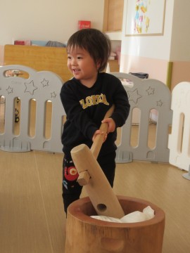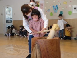 小さいおともだちは、ダミーのお餅⚪を小さい臼と杵を使い、『ぺったん、ぺったん』とつきました✨