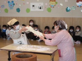 みんなでついて完成したお餅⚪を触って『のびる~😲」と感触も喜んでいました😊