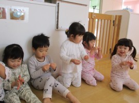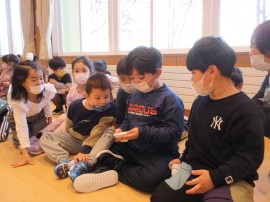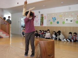 大きいおともだちは、ホールに集まって、おもちつきの紙芝居を見た後に炊いたもち米🍚を1人ずつ重たい杵💦を持ち