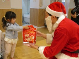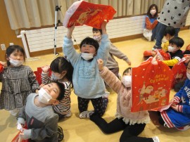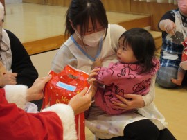 今年は本物のサンタさん🎅が風邪を引いてしまい、こども園に来れなくなってしまったので、今回は職員が変身したサンタさん🎅から、1人ずつプレゼント🎁をもらいました。