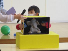 出し物では職員が、ちいさいおともだちには大型絵本📖『へんしんトンネル』を、おおきいおともだちには『箱の中身は何だろうな❓』をしました。