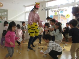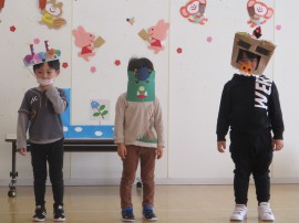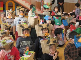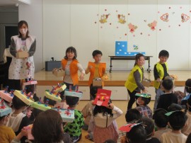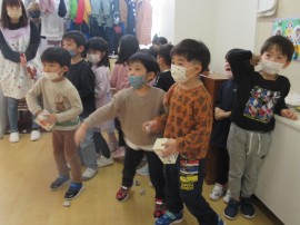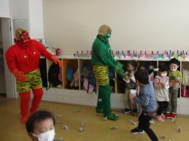 無事に退治し終わって、お遊戯室で福の神から豆をまいてもらい、健康で元気に過ごせますようにと幸せを祈りました😊