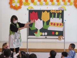 ちゅうりっぷ🌷の歌を歌った🎵後に、お誕生児さんがお遊戯室内にある『ちゅうりっぷ🌷』を探すという内容で、他のおともだちも『あっち❗』『あれ❗』と教えてあげる姿もあり、みんな楽しく参加していましたよ😊