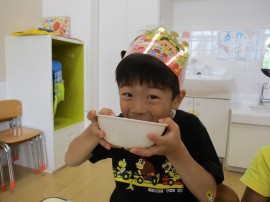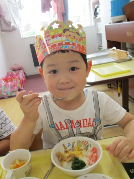 久しぶりの全クラス参加でのお誕生会、たんぽぽ・ゆり・ひまわり組さんは、3クラス一緒での会食で、みんな喜んでいました😄