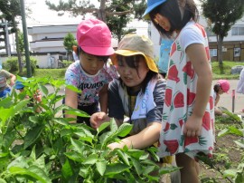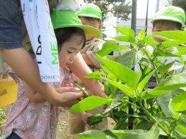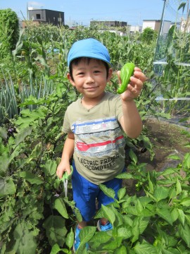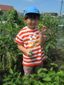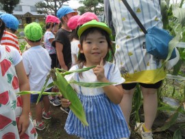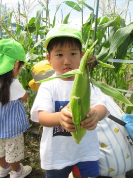 永山おおぞら認定こども園 🌽 菜園 収穫 🌽 2023年8月12日(土) 今日は、登園した たんぽぽ・ゆり・ひまわり組の12名で菜園に行ってきました❗5月に植えたピーマンと とうきび🌽を1人1つずつ収穫してきました。はさみを上手に使いピーマンを収穫し、とうきび🌽は両手で『よいしょ~❗』と もぎって取り楽しそうでした😊収穫したとうきび🌽は、今日のおやつに食べ、みんな『美味し~』と喜んで食べていましたよ🤭暑い中でしたが、たくさん歩いて頑張って収穫してくれました😄 もどる