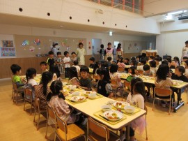 新型コロナウイルス感染症対策で止めていた、『たんぽぽ・ゆり・ひまわり組』3クラス一緒の会食を今月から再開しました。