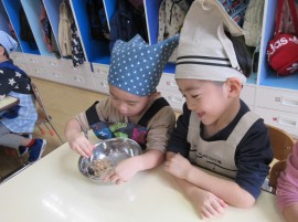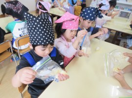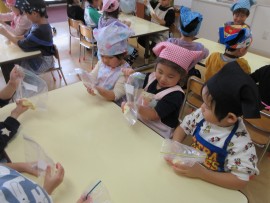 ボウルに入ったツナにマヨネーズを混ぜたり、ひとり一袋ずつジップロックを持って、卵🥚とマヨネーズを入れて、もみこんだりと、みんなしっかりと説明を聞いて取り組んでいましたよ👍