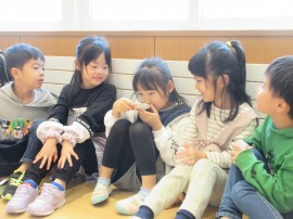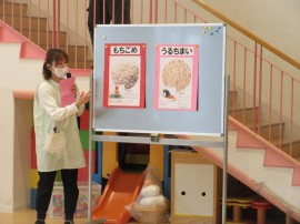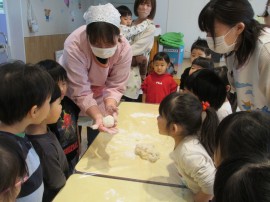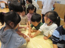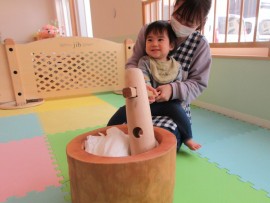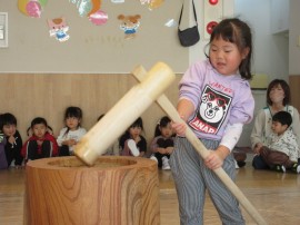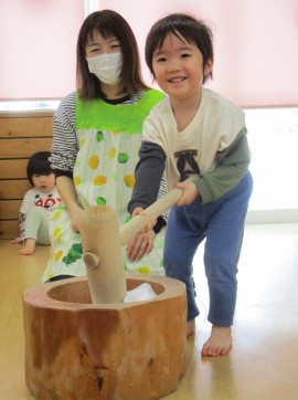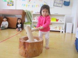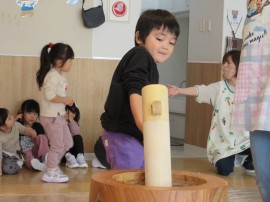 ちいさいおともだちは、お部屋でお餅⚪に見立てたものを臼に入れて、おもちつきの疑似体験をしました。