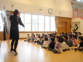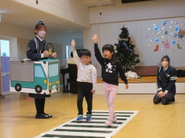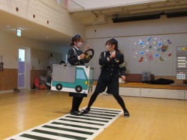 旭川市役所から交通課のお姉さん👮♀️と、ネコの着ぐるみ『ミーコちゃん🐱』が来てくれて、交通ルールについてお話をしてくれました。