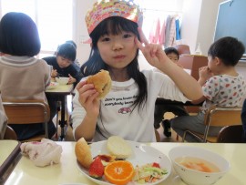 今日の会食メニューにハンバーガー🍔があり、自分でパンにハンバーグや野菜をはさんで食べました。