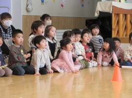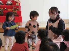 担当の先生から、おひなまつり🎎の由来やそれぞれの人形達の役割などのお話を聞いた後に、各クラスで制作した作品を代表さんがみんなの前で発表してくれました。