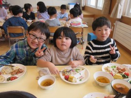 給食では、おおきいおともだち3クラス一緒にお遊戯室で会食🍴をしました。