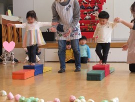ちいさいおともだちは、ひなあられに見立てたボール🟢をカゴに入れるゲームで、どのボールにしようか考えながら楽しむことができていましたよ😍