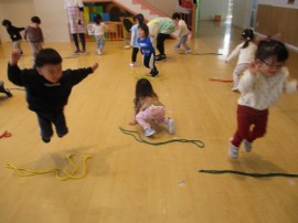 永山おおぞら認定こども園 体操教室 2024年4月10日(水) たんぽぽ組 初めての体操教室‼体操の先生に少し緊張気味の子どもたち。お話を聞いて、楽しく体操できました😊 縄跳びもしました!せーの、ジャンプ‼ もどる