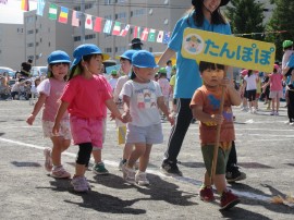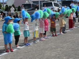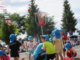 応援合戦や体操、障害物競争、玉入れ、お遊戯、リレーに