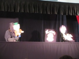 劇団作の人形劇「ぐうたらおうじとまねっこおうじ」を
